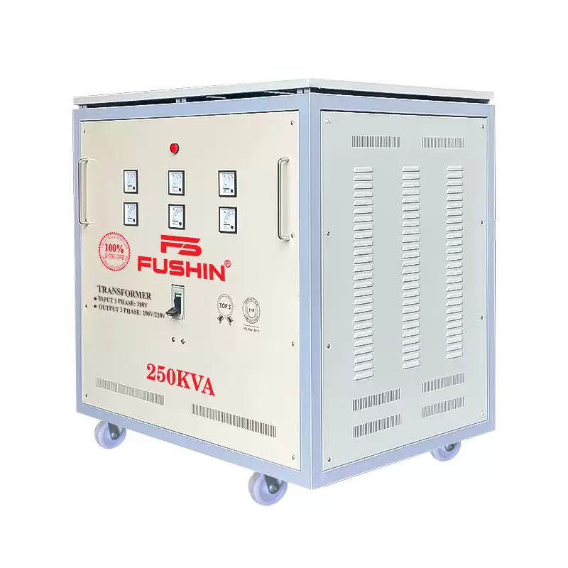 Biến áp FUSHIN 250KVA đổi nguồn 3 pha 380V ra 3 pha 200V hoặc 220V, phù hợp cho các thiết bị điện 3 pha nội địa Mỹ, Nhật, Đài Loan. Máy thích hợp cho các thiết bị có công suất dưới 250KVA, đảm bảo nguồn điện ổn định, hiệu suất cao và không hao tổn điện năng.
