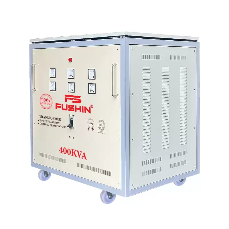 Biến áp FUSHIN 400KVA đổi nguồn 3 pha 380V ra 3 pha 200V hoặc 220V, phù hợp cho các thiết bị điện 3 pha nội địa Mỹ, Nhật, Đài Loan. Máy thích hợp cho các thiết bị có công suất dưới 400KVA, đảm bảo nguồn điện ổn định, hiệu suất cao và không hao tổn điện năng.