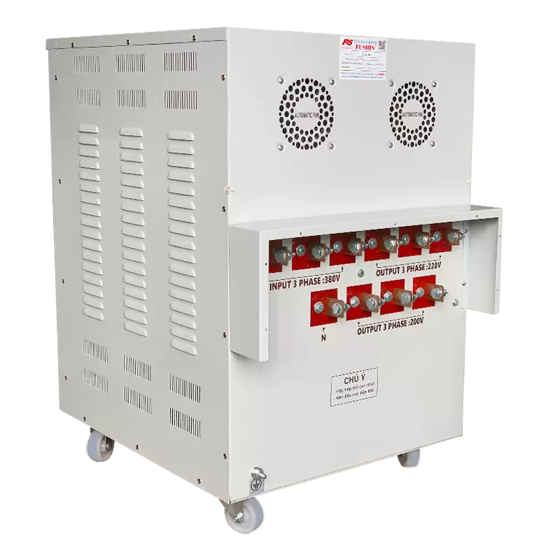 Biến áp FUSHIN 75KVA đổi nguồn 3 pha 380V ra 3 pha 200V hoặc 220V, phù hợp cho các thiết bị điện 3 pha nội địa Mỹ, Nhật, Đài Loan. Máy thích hợp cho các thiết bị có công suất dưới 75KVA, đảm bảo nguồn điện ổn định, hiệu suất cao và không hao tổn điện năng.