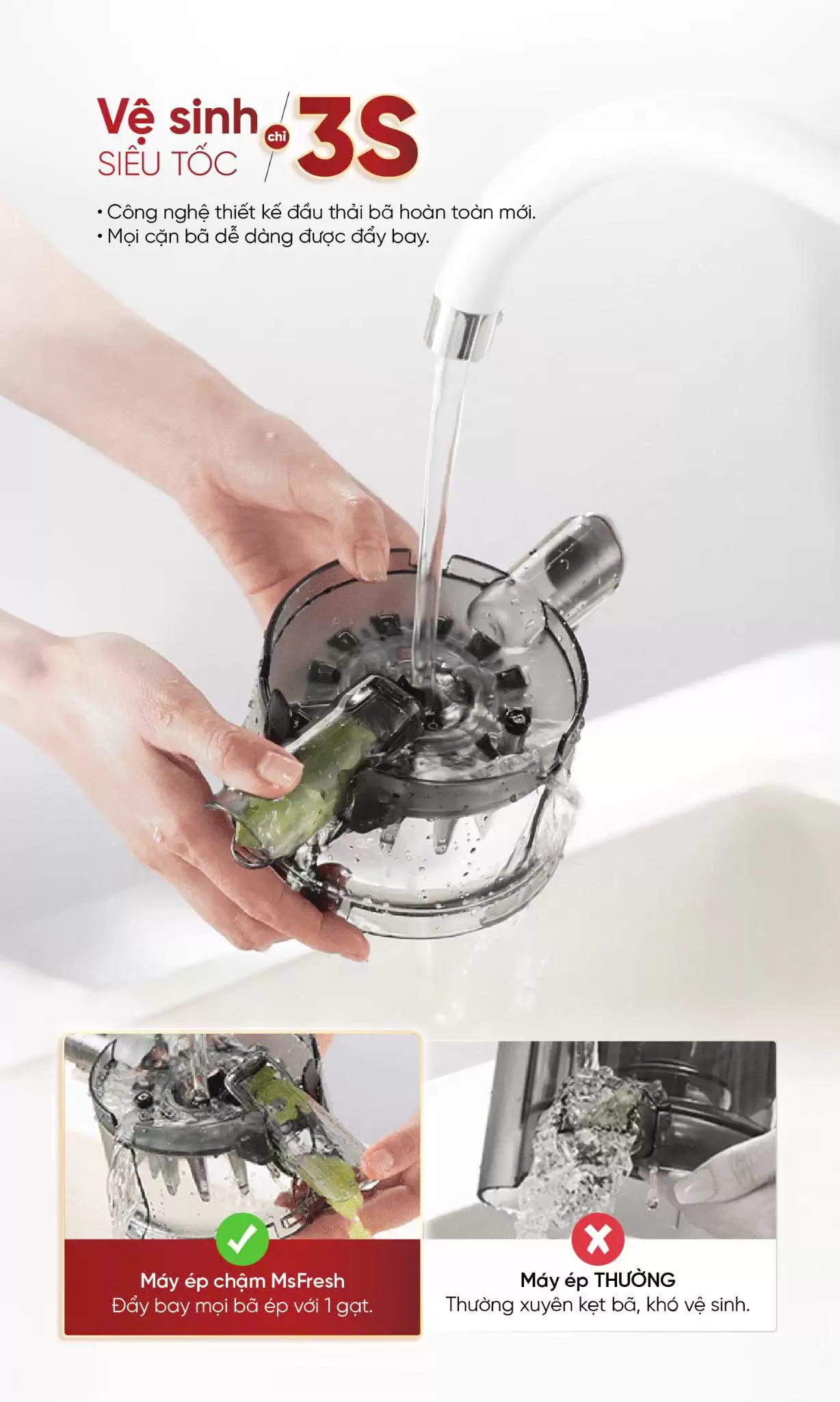 Các thành phần của máy ép chậm MSFresh được thiết kế độc lập dễ dàng lắp ráp và tháo rời thuận tiện cho việc vệ sinh. Không chỉ vậy, máy cung cấp chổi vệ sinh riêng giúp loại bỏ bã hoa quả bám sâu trong cối ép, lưới lọc một cách nhanh chóng và dễ dàng.