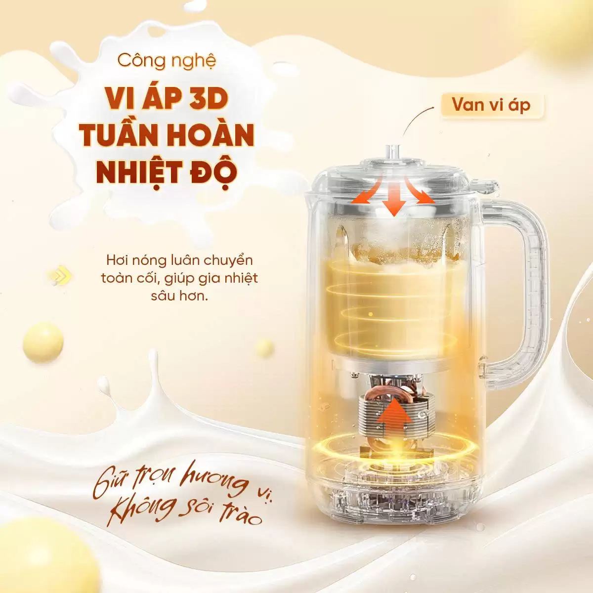 - Nhờ đó, nhiệt và hơi nóng được luân chuyển liên tục, tạo ra dòng tuần hoàn nhiệt 3D khép kín, giúp sữa được nấu mịn hơn, thơm hơn, không trào và đặc biệt giữ trọn dưỡng chất thực vật